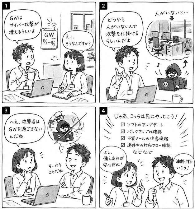 ゴールデンウィークなどの長期休暇は、サイバー攻撃が「増える」というよりも、